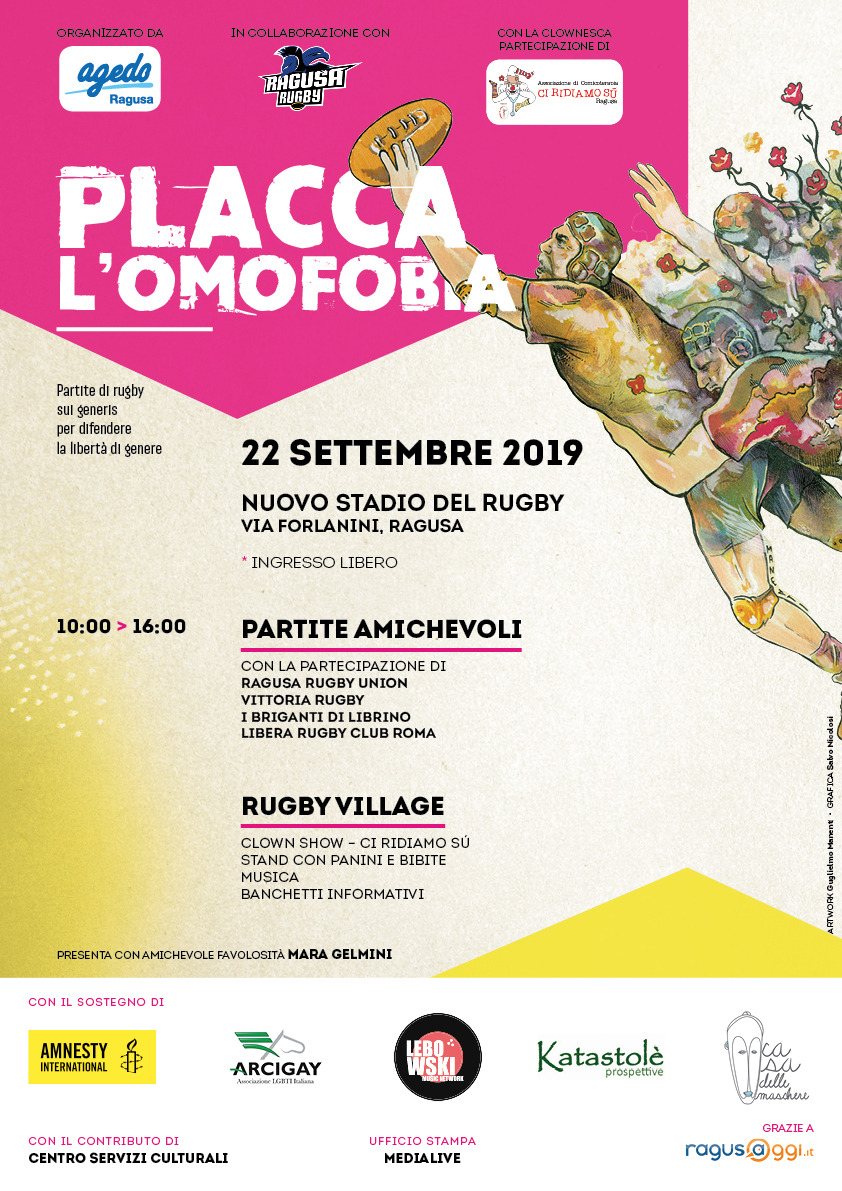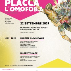 Intanto al campo di rugby è già tutto pronto per l’evento di questa domenica. E’ stato montato il village dove troveranno posto gli stand delle varie associazioni che aderiscono e partecipano a “Placca l’omofobia”: Amnesty International Ragusa, Arcigay Ragusa, Lebowski Music Network, Katastole’ Prospettive e Casa Delle Maschere. Un’intera giornata di condivisione e sano sport, una domenica colorata di vita e di diritti, a partire dai colori che, oramai da tradizione, decoreranno il viso dei giocatori. Tra una partita e l’altra i divertenti interventi dei clown dottori e poi l’atteso terzo tempo con una grigliata collettiva all’interno del village con stand per il food e banchetti informativi. Anche quest’anno la grafica dell’evento è stata curata da Salvo Nicolosi e le illustrazioni di Guglielmo Manenti. Per info: pagina facebook Ragusa Rugby.