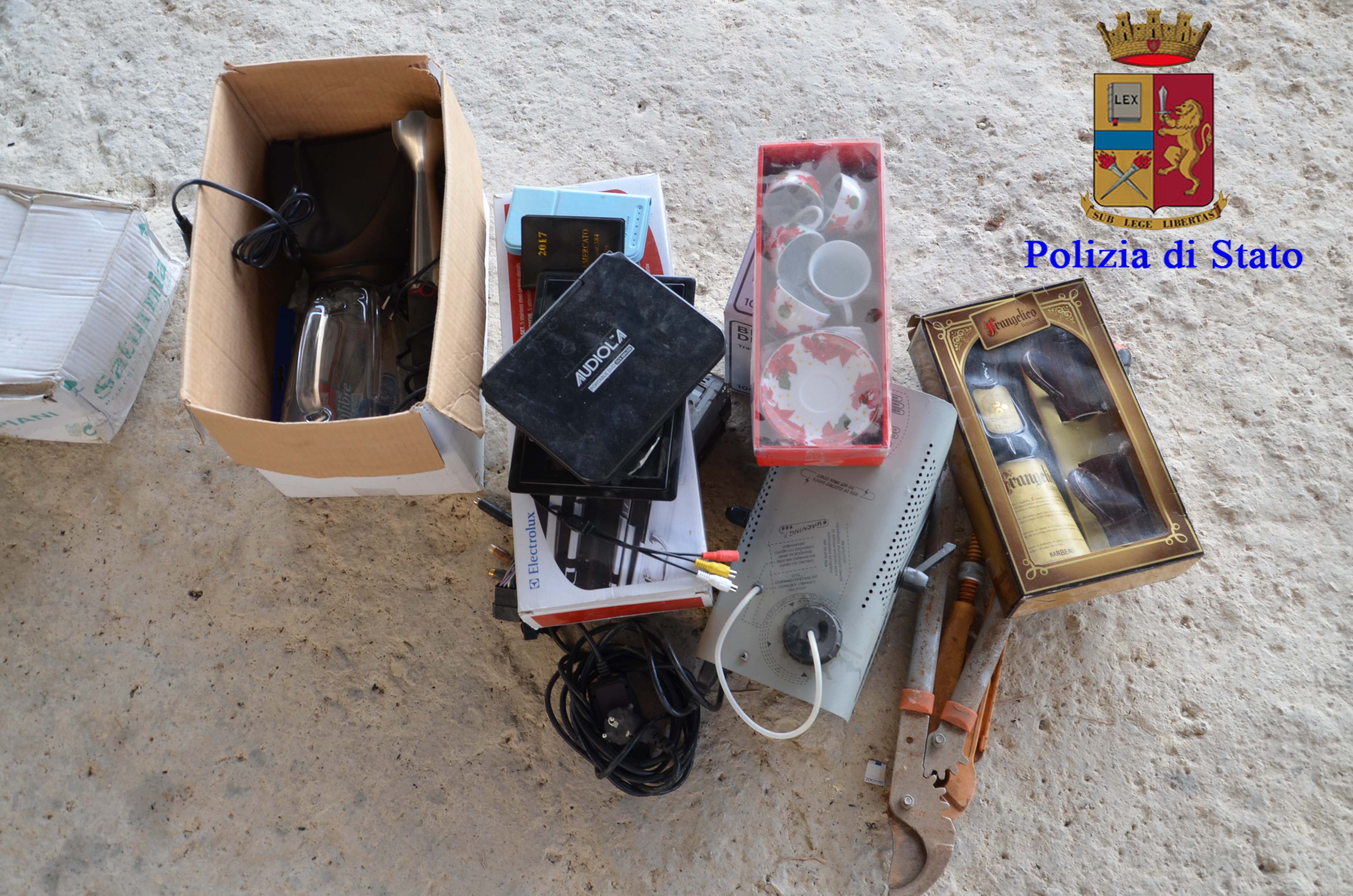 Tra le decine di oggetti rinvenuti vi sono: Televisioni, casse acustiche, tagliaerba, soffiatori, compressori, autoradio, coltelli da macellaio, ganci “appendi animali”, oggetti in oro, banconote di valuta estera, macchine da cucire, elettrodomestici da cucina di vario tipo, computer portatili di diverse marche, telefoni cellulari ed altri oggetti.