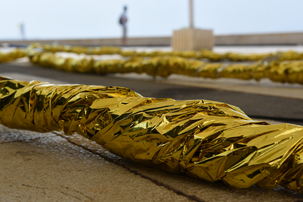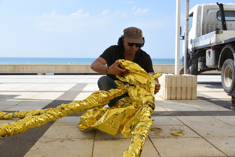 E poi c’è il blu del mare, che è il blu scuro della tragedia. Il sogno lega questo mare blu scuro al mondo dorato che ho voluto rappresentare per creare i contorni della barca utilizzando le coperte isotermiche che vengono date ai migranti quando sbarcano, il primo momento di incontro con quella che, almeno nella speranza, rappresenta la loro nuova vita. Non è e non vuole essere un’idea onirica, ma un’idea di speranza e al tempo stesso di disperati, laddove i disperati non sono solo quelli che prendono una barca, abbandonano tutto quello che hanno e tentano il viaggio della speranza, ma sono anche i disperati che sono ai margini della nostra società e che le luci dorate e accecanti nascondono nel tentativo di comunicarci sempre e solo l’idea di benessere, lo stesso che anche i migranti nelle barche inseguono. Ma sappiamo tutti che non è così.