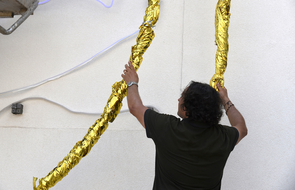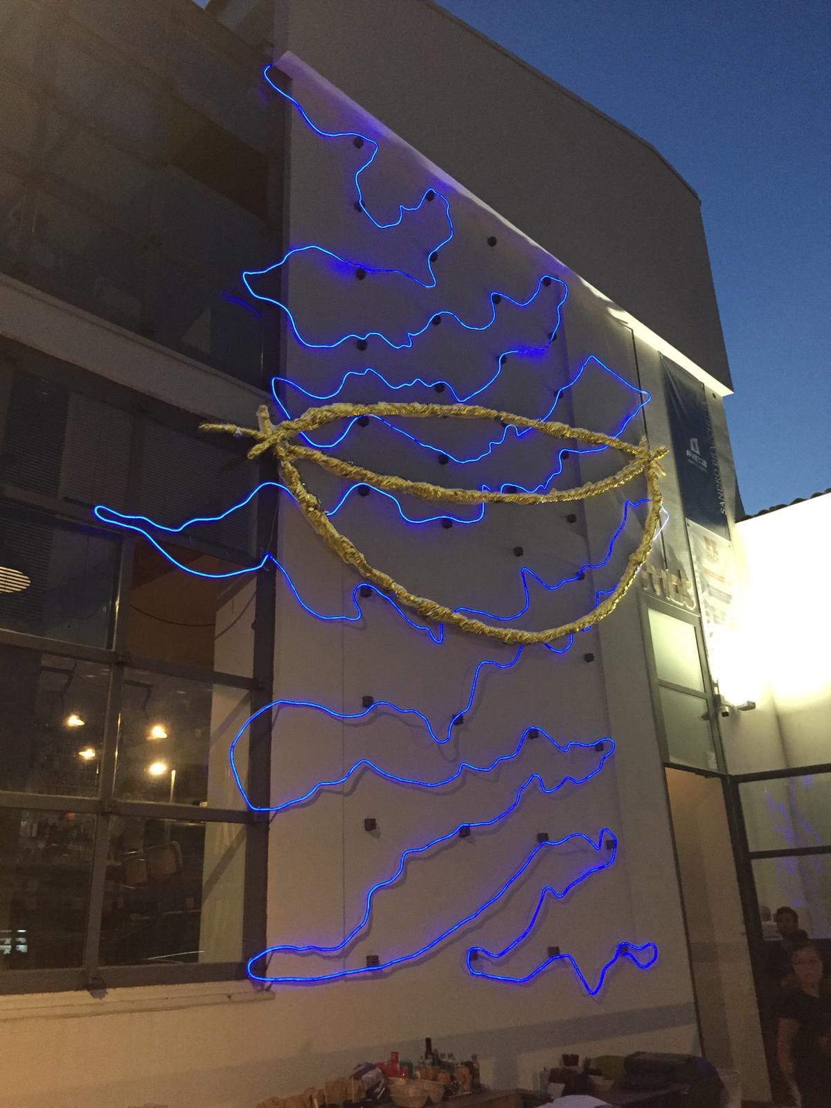 Da qui la scelta dei materiali per un’opera che di giorno luccica con il suo dorato e che di notte viene sovrastata dal blu delle onde scure, quasi inghiottita. Tutto è partito da un segno, così come il racconto della barca e del mare, con le sue onde che non sono calme ma che diventano percorso di un tumultuoso tragitto. Ho affrontato la fragilità di questo viaggio, rappresentato dalla barca-guscio piena di speranza, con la voglia di arrivare, di sopravvivere, come tanti nuovi Robinson, mentre le onde, che di sera nell’installazione sono luminose, nascondono la barca dorata, che è poi anche il drink della nostra falsa società felice.