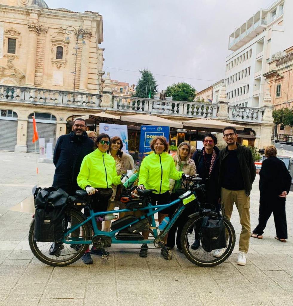 Ragusa ha accolto, in piazza San Giovanni, Giusy Parisi e Chiara Ozino, le due protagoniste del progetto “In tandem alla cieca”, che stanno percorrendo in bici il periplo della Sicilia, partendo da Palermo e tornando nel capoluogo siciliano dopo oltre mille chilometri lungo le coste dell’isola.