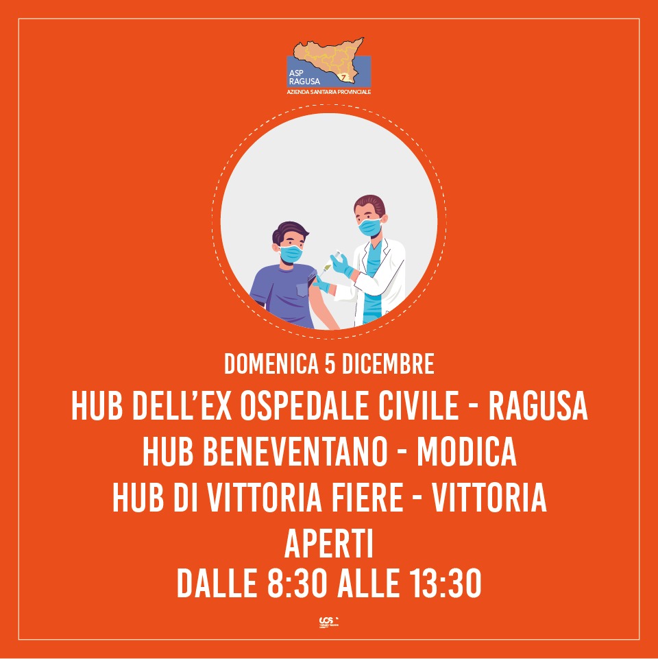 Domenica 5 dicembre 2021 gli hub di Ragusa, ex ospedale Civile; Modica, contrada Beneventano e Vittoria, Fiere, resteranno aperti dalle ore 8:30 alle 13:30.