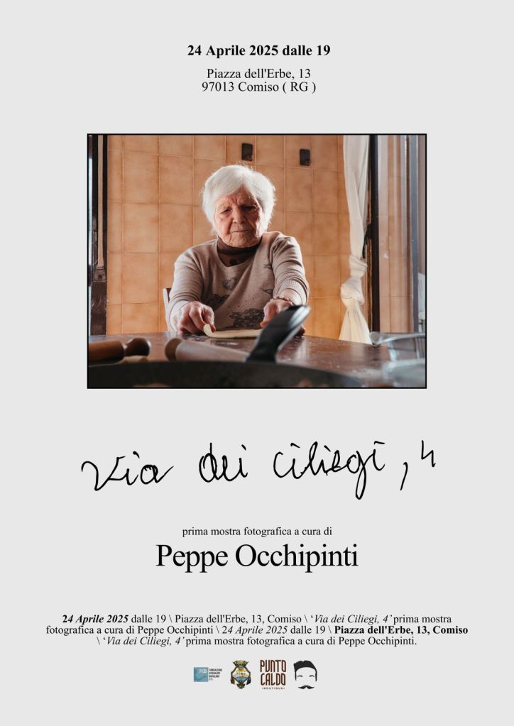 COMISO (RG) – Ci sono luoghi che non esistono sulle mappe, ma che abitano dentro di noi. E ci sono gesti che, più di mille parole, raccontano chi siamo. La mano rugosa che affonda nella farina, la pasta che si stende lenta, il pane che nasce da un avanzo d’amore, da un resto di impanata pasquale. È nei ricordi di bambino che nasce “Via dei Ciliegi, 4”, la prima mostra personale di Peppe Occhipinti, giovane videomaker e fotografo ibleo. Si inaugura il 24 aprile alle ore 19,30 alla Fondazione Bufalino di Comiso.