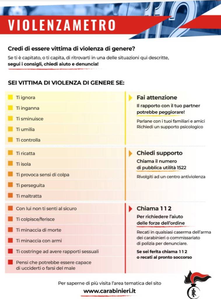 Sul sito istituzionale dei Carabinieri è stata dedicata una sezione al Codice Rosso, con informazioni utili sulle tutele previste per le vittime e strumenti come il “Violenzametro”, un test di autovalutazione che aiuta a riconoscere segnali e livelli di violenza in un rapporto affettivo.