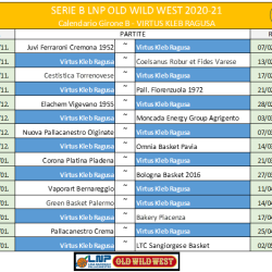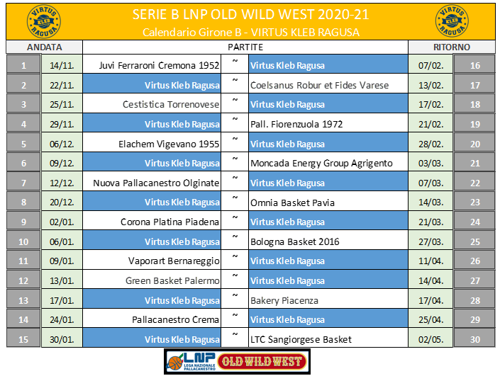 La Lega Nazionale Pallacanestro ha appena diramato il calendario della Serie B, stagione 2020/21 che prenderà il via il 14 novembre. La Virtus Kleb Ragusa esordirà nel terzo campionato nazionale in trasferta contro Juvi Ferraroni Cremona 1952. La prima al Pala Padua sarà il 22 novembre contro la Coelsanus Robur et Fides Varese.