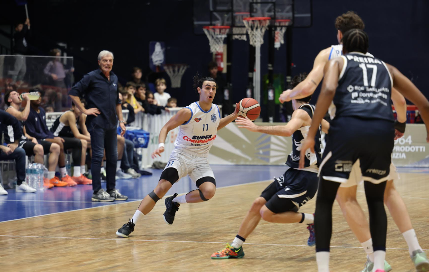 Al ritorno sul parquet la “costante Adeola” continua a punire con regolarità dall’arco (65-53 al 23’). La partita registra alti e bassi, alterna momenti di confusione a grandi gesti di atletismo. E per questo è difficile controllare ritmo e avversari. Si procede a sgasate. Quella di Brown ripristina la doppia cifra di vantaggio per la SuperConveniente, mentre la tripla di Lanzi, apertissimo sul perimetro, rimette quindici punti fra le squadre costringendo al timeout Miriello (72-57). Il fallo tecnico ad Ani regala a Brown il +18. L’appoggio di Piscetta vale il nuovo massimo vantaggio (79-59), ma arriva ancora Tumino col canestro al fotofinish e la Virtus fugge via: 83-62 al 30’. Il quarto quarto sembra da subito una formalità grazie alla tripla di Ianelli (+25). La SuperConveniente, di fronte al pubblico delle grandi occasioni, commette l’errore di alzare un po’ presto le mani dal manubrio, concedendo la scena all’ex di turno Zanetti (90-74 al 35’). Valle segna la tripla del -12 e Di Gregorio rimette mano ai timeout. Lanzi, con la terza tripla, dimostra ch’è stata una scelta saggia. Brown e Fabi, superando quota 100, formalizzano il successo. Stavolta sì, è sipario.