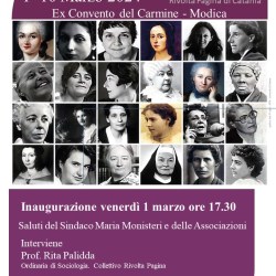 Il prossimo 1 marzo, alle ore 17.30, nei locali dell’ex convento del Carmine di Modica, si inaugura la mostra “Vite di donne nella Storia – Anche la cancellazione è violenza”, sostenuta dall’Amministrazione comunale di Modica e dalla Fondazione Teatro Garibaldi in stretta collaborazione con una rete di associazioni che operano nel sociale in città. Tale mostra documentaria, ideata e curata dall’associazione Rivolta Pagina di Catania, è una raccolta di circa sessanta pannelli in cui è possibile leggere storie di donne spesso cadute nel dimenticatoio. L’occasione è imperdibile per chi voglia conoscere e non dimenticare quelle figure femminili che uscendo dalla vita ordinaria hanno lasciato il segno nella storia da raccontare. Il giorno dell’inaugurazione, il 1 marzo, ci sarà anche l’occasione di confrontarsi con la curatrice della Mostra, prof. Rita Palidda dell’Università di Catania, sociologa, e con i rappresentanti delle associazioni che hanno aderito all’iniziativa. Sarà presente il Sindaco Maria Monisteri a portare il saluto della città. La mostra resterà aperta fino al 10 marzo.